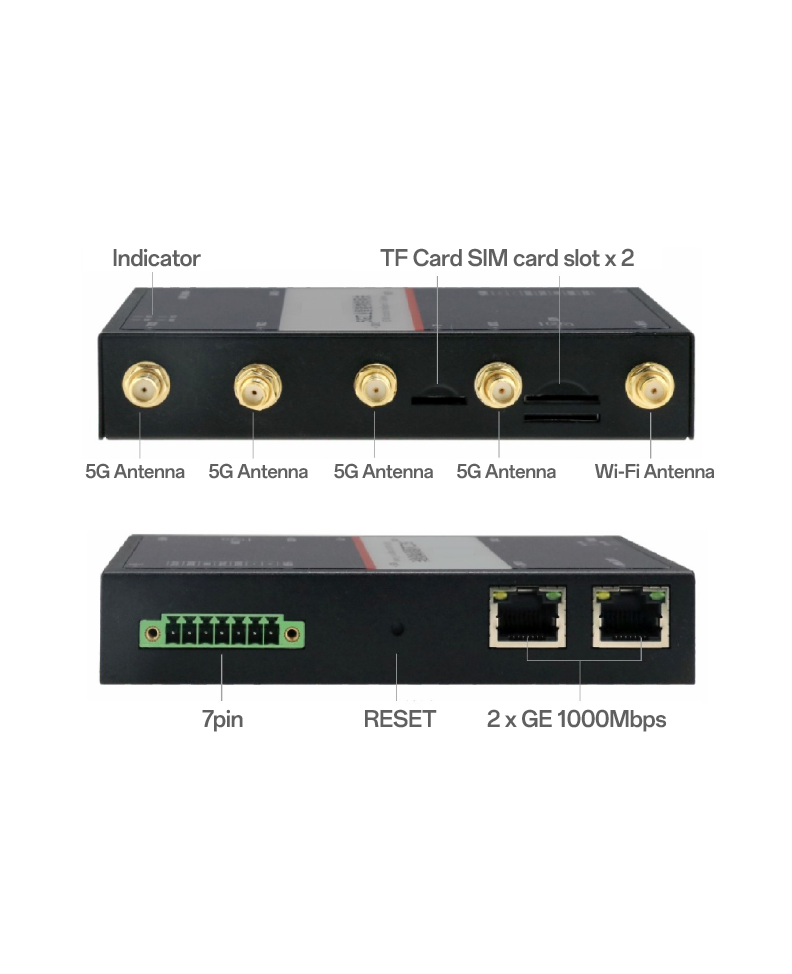 バックパネルインターフェース | 1*TFカードインターフェース 2*SIMカードインターフェース 5*アンテナインターフェース(SMA-K female) | |