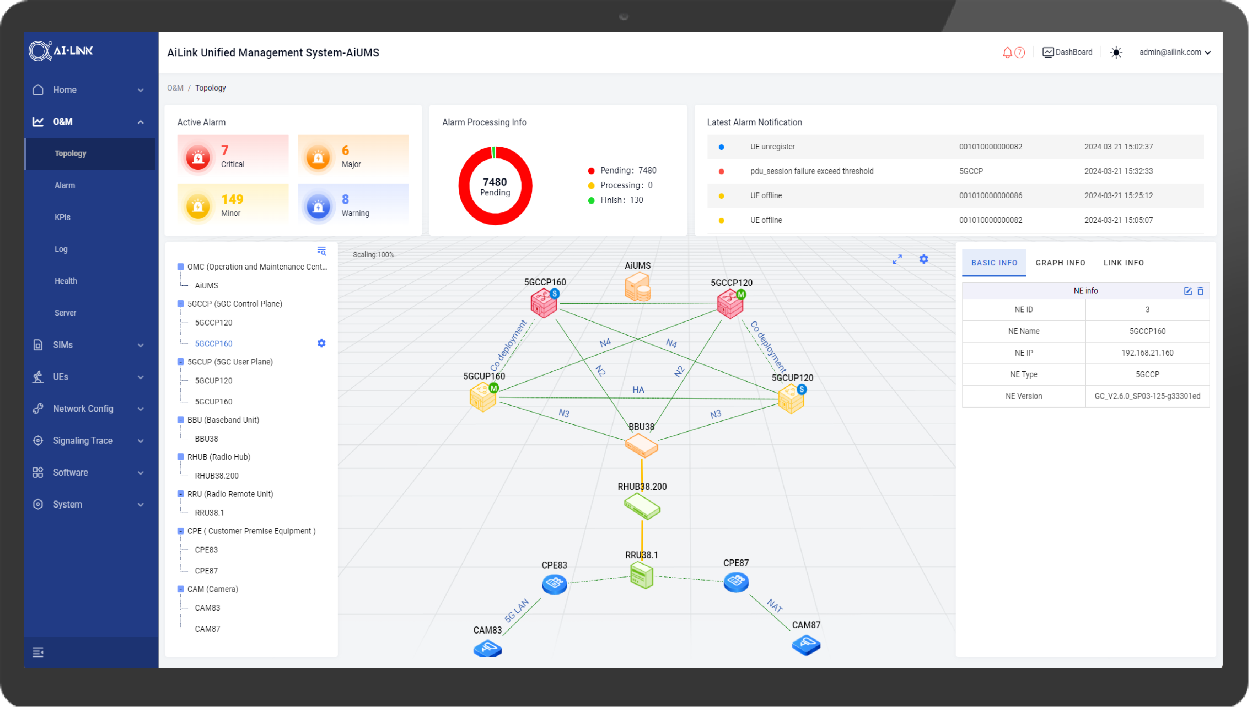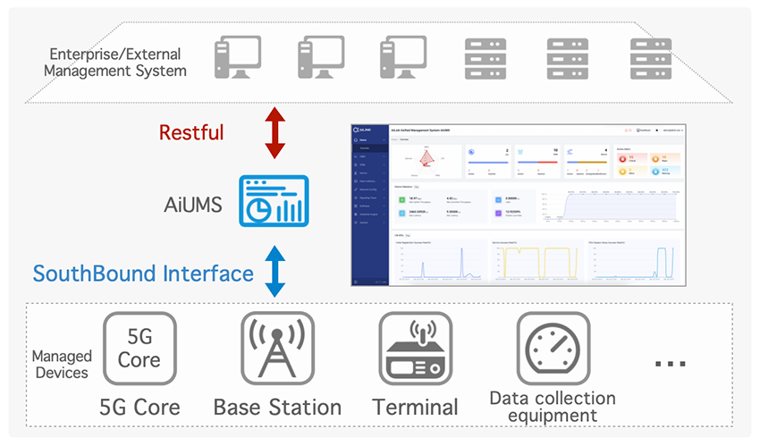 AiUMS3000総合管理プラットフォームは、AILINKが工業シーンのために提供する一体型総合運用保守管理プラットフォームであり、OICT一体型共同保守共同管理の設計理念を元に、5Gコアネットワーク、ワイヤレス、端末、工業機器などのネットワークエレメントを統一的に管理し、全面的な運用保守管理サポートを実現することができる。